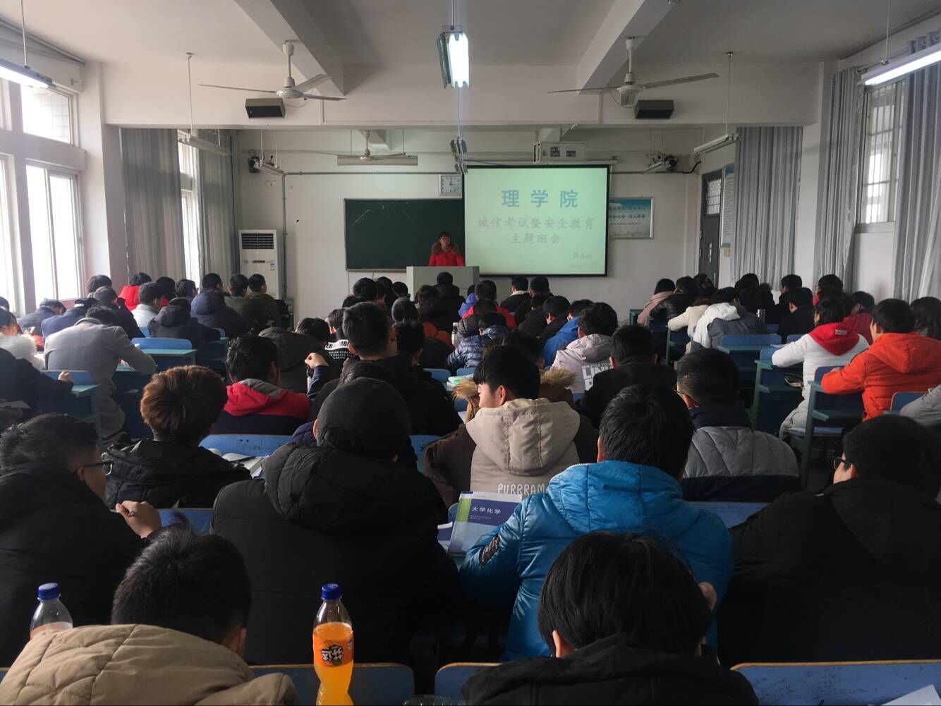 寒假将至,为树立良好的考风、考纪,培养学生诚信意识,提高学生假期安全防范意识和避险能力,保障学生生命和财产安全,理学院各班级于2018年1月上旬相继召开诚信考试暨安全教育主题班会,并组织理学院全体学生签订诚信考试承诺书。