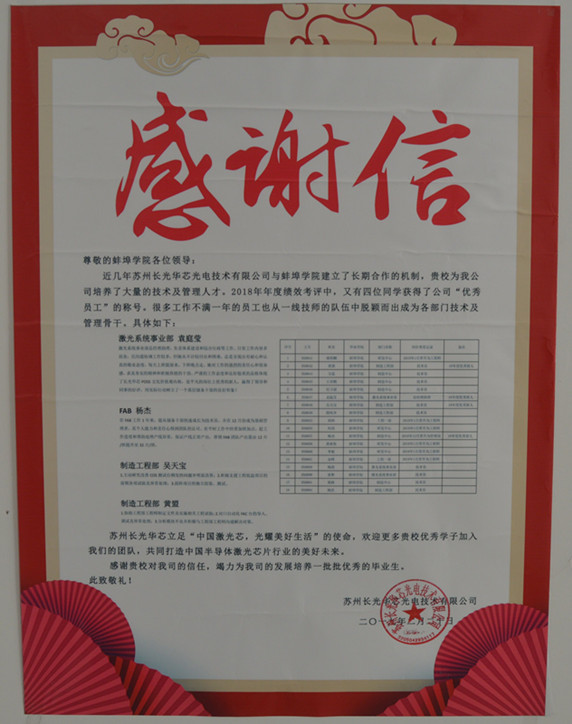 近期,理学院收到了苏州长光华芯光电技术有限公司寄来的感谢信,对我校在该单位就业的2018届毕业生质量予以高度评价,对学校和学院的培养成果表示诚挚感谢。